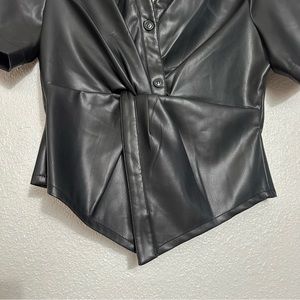 Faux Leather/Vegan Leather Twisted Front Detail. Short Sleeve Top with Collar and Front Button closure