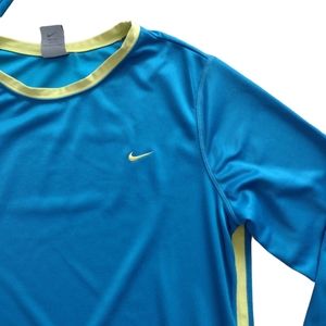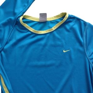 Lovely pre-owned Nike women's Long sleeve T-shirt. Dri-fit technology. Blue and bright green trim and green stitching. Size is L(12-14).