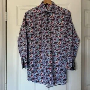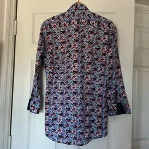 7 DOWNIE ST. LONDON Button down shirt. SIZE “4” (M). Blue with red & pinkish flowers. Contrasting collar and wrist cuffs. Soft fabric. (Feels like a cotton). No material/care tag. Sturdy neck collar. EXCELLENT CONDITION. No rips, tears or stains. All stitching tight.