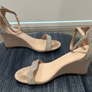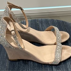David’s Bridal Raquel embellished wedges. They are a very pale pink with clear crystals. The heel, the ankle strap, and the strap across the toes are embellished. Adjustable ankle strap. Heel is about 3”. These have had use so there are marks, particularly the footbed. Synthetic. Size 8.5.
