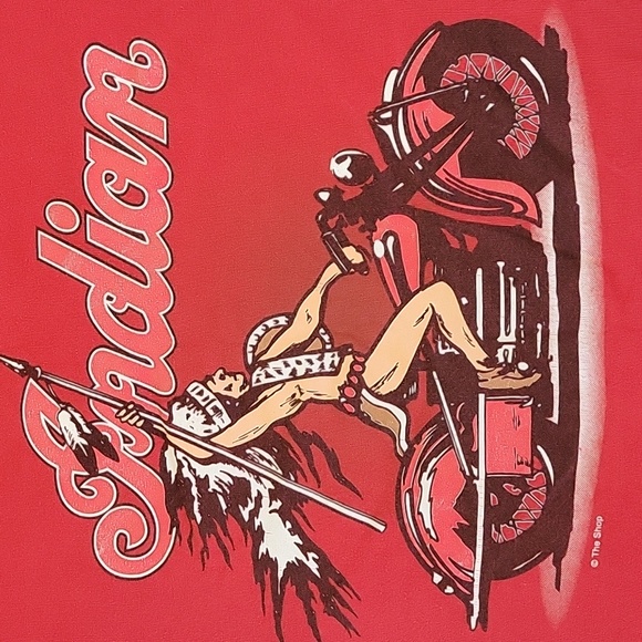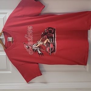 Vintage Indian Motorcycle Red TShirt Size Medium . Excellent Graphics. Small Hole Under Right Arm and On Front Hem. See Photos For Flaws and Measurements. 100% Cotton Made In Hati.