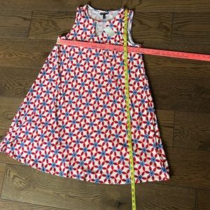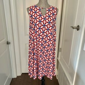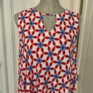 This sleeveless dress features an Americana floral design on soft lightweight stretch fabric, a round neckline with keyhole detail, and a relaxed fit.