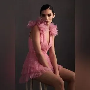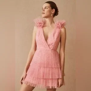 ML Monique Lhuillier Perrie Tiered Shoulder-Ruffle V-Neck Mini Dress