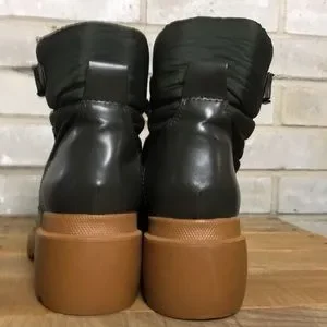 "Army-inspired mixed media boots with a buckled vamp and chunky, colorblocked midsole and heel."