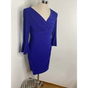 Ralph Lauren Dress Royal Blue 8 Ruched Side V Neck Wiggle Midi 3/4 Ruffle Sleeve