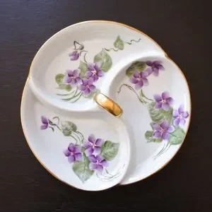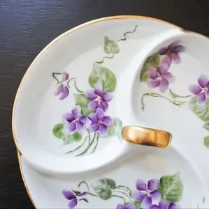 Vintage Mid Century Hand Painted Purple Flower Jewelry Trinket Dish