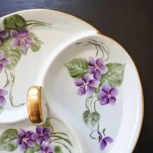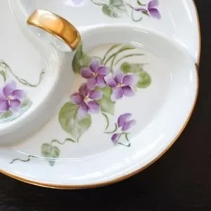 - White porcelain hand painted with detailed purple flower designs with gilt highlights