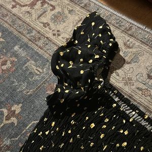 Mini length, but hits me just barely above knee, so a more modest length (I’m 5’3” for reference). Smocked and flares out. Perfect for spring and summer, so don’t wait!