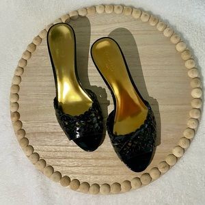 Stay sleek in these gorgeous IZABEL black patent-leather kitten heels from COACH. The cut-out pattern adds a touch of sophistication to these open toe slip-on heels. Perfect for any occasion, from business casual to parties and cocktails, these kitten heels are a must-have in your shoe collection.