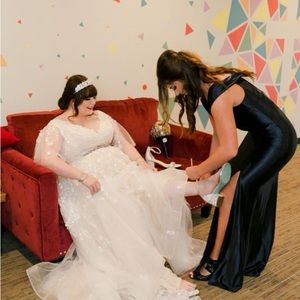 Plus size vintage wedding dress flutter sleeve and open back blush under layer