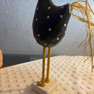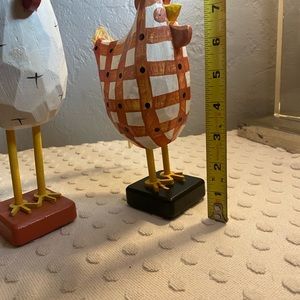 Adorable pair of farmyard birds! Tall black polka dot rooster stands proudly next to a sweet red gingham chicken. Fun raffia tails. Painted wood. Nice pre-owned condition, the red and white has a tiny bit of damage on his foot please see last pics. But please see ALL pics for the accuracy of my description as well as the condition of the roosters. Contact me with any other questions you may have. Thank you.