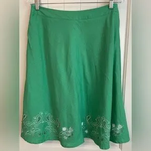 Apostrophe women’s linen blend midi A-line paisley embroidered skirt, fully lined, in green.