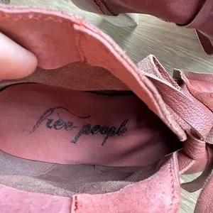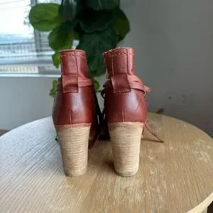 Free People Leather Booties with ties. Beautiful Cognac Color. Size 37. Excellent Condition, minimal signs of wear. Heel approximately 3in tall.