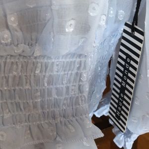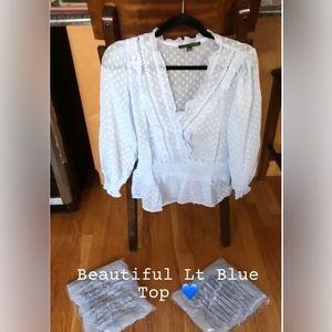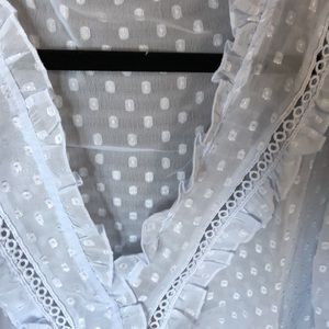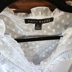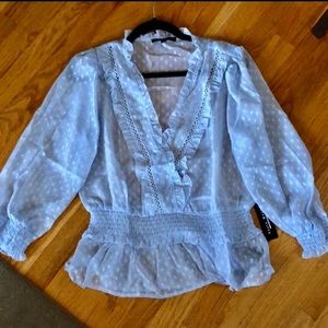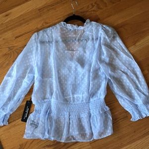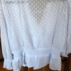 Beautiful sheer blouse featuring long cinched sleeves, and ruffle details.