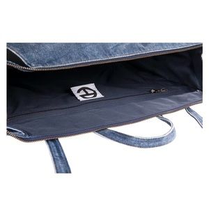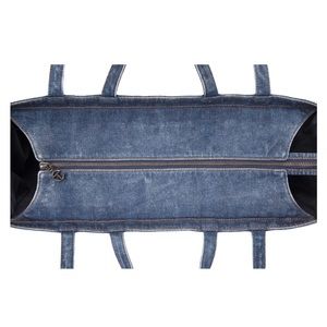 Featuring a double strap (handles and cross-body straps), embossed logo, debossed real leather patch, contrast top stitching, internal zip pocket and zipper closure. Made from washed denim with twill lining. Bag is packaged in a drawstring bag with screen-printed logo.