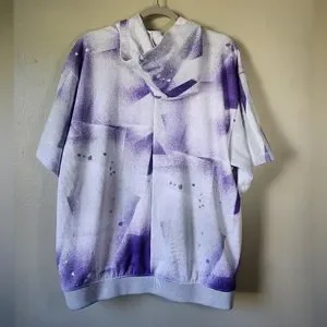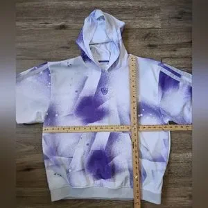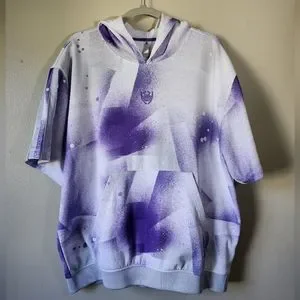 Elevate your activewear game with this Adidas Donovan Mitchell Shooter Hooded Short Sleeve Sweatshirt in a stylish white and purple paint splashed pattern. The loose fit and knit fabric type make it perfect for any season, whether you're hitting the gym, cycling, cross training, playing basketball, or going for a run.