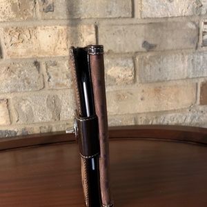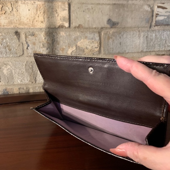 This beautiful Coach wallet is canvas exterior, trimmed in leather with contrast stitching and a silver twist lock, and a milk chocolate leather interior. There are no callouts; it is in excellent pre-owned condition. Please see photos for full description. The last photo shows it along side a Coach bag of the same style, albeit a very slight difference in the dye lot. The purse is not included but the pair would go well together. This wallet would also look great on a silver or bronze chain (sold separately) and worn as a shoulder bag or crossbody.