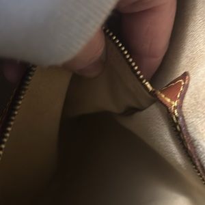 Purchased years ago and it has been sitting. Notice in great condition other than handles need to be resown. It can be used I just decided to not put that wear on her anymore! Very pretty bag!!! Other than that! Zippers work great! 😊
