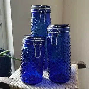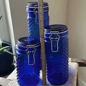 Vintage cobalt blue hobnail glass canisters set of three. Gorgeous set of three cobalt blue hobnail canisters with gasket seal. Tallest canister has a few cracks but very hard to show (last few pics try to show). Totally still usable and almost unable yo detect. Other two canisters are EUC. Retro kitchen housewares stash containers. Spaghetti canister. Coffee tea canister.