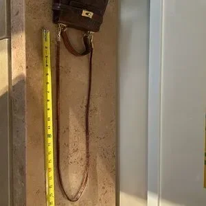 top handle has bend, detachable long cross body strap (needs a couple of stitches soon), brass shows scratches, shape relaxed,