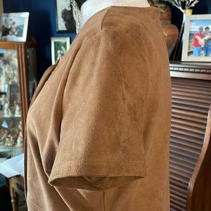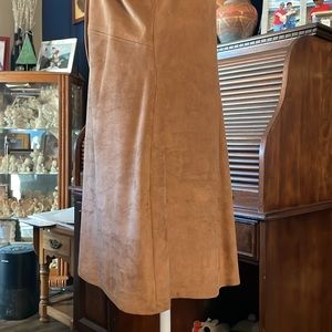 Faux suede dress by Express in a light brown, fawn shade very soft to the touch. Has an A-line shape so it is fitted at the waist, has a crew neck, short sleeves, a tie at the bodice so you can show a little or a lot of cleavage, a back zip, and has a silky lining next to your skin. Brand new without tags, never been worn, and lying flat measures approximately 19 inches armpit to armpit, 17 inches at the waist, and 32 1/2 inches shoulder to hem. Is made of a polyester/spandex mix and is hand wash only.