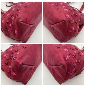 ❣️JIMMY CHOO STAR STUDDED TOTE❣️LEATHER. BURGUNDY IN COLOR WITH DIFFERENT COLOR PINK STAR STUDDING THROUGHOUT EXTERIOR. SILVER TONE ACCENTS. DUAL TOP HANDLE STRAPS. NO EXTERIOR POCKETS. EXTERIOR JIMMY CHOO CHARM. INTERIOR ZIPPER POCKET. MINIMAL RUBBING TO CORNERS AS SHOWN IN PHOTOS. HANDLES IN GOOD USED CONDITION, SOME RUBBING MAY BE PRESENT (NOTHING MAJOR). INTERIOR FULLY LINED WITH SIGNATURE JIMMY CHOO FELT TAN LINER (NO STAINS OR RIPS PRESENTS - SOME LOOSE PARTICLES MAY BE PRESENT FROM STUFFING TO MAINTAIN BAGS SHAPE). INTERIOR ZIPPER WORKS GREAT. MINOR SCRATCHES TO HARDWARE FROM NORMAL USE. APPROXIMATELY 10.2” (H) x 12.5” (L) x 5.5” (W). APPROXIMATELY 10-12” DUAL HANDLE STRAP DROP.