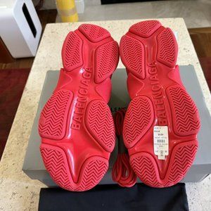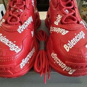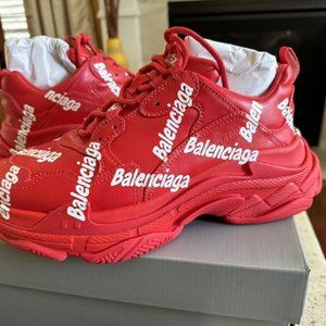Elevate your sneaker game with these Balenciaga Triple S Allover Logo 43 (US Size 10) sneakers. Designed for men who love to stay on-trend, these athletic shoes add a pop of color to your wardrobe with their vibrant red hue. The shoes come brand new in box, ready to be worn for any performance or activity, from boxing to running.