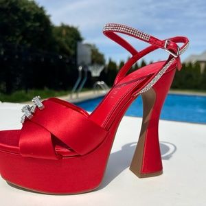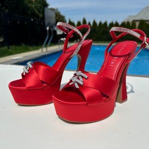 Gianni Bini 10 Dempsey Red Satin Rhinestone Bow Platform Sandals