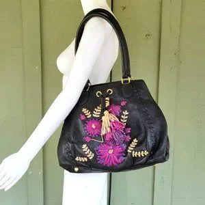 ISABELLA FIORE Black Leather Floral Shoulder Bag