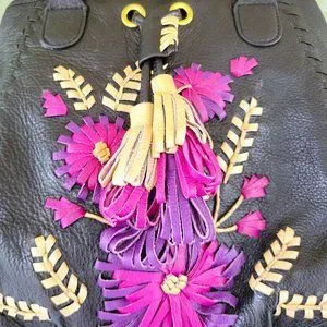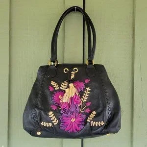 The exterior has leather embroidery in a floral design. The sides can be made smaller with snaps or you can widen it out, more of a tote style. There is a zippered pocket on the back. The interior has multiple sections with 2 zippered pockets, slips and credit card slots. The has a flap closure with a magnetic snap