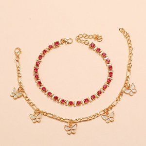 Bohemian 2pcs 18K Gold Plated Pink Crystal Anklet Bracelet Gold Butterfly Charm set