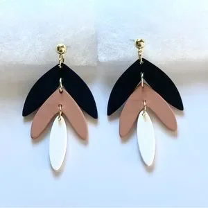 Playful three layered neutral chevron gold toned stud earrings. The first layer is black, the second is a warmed toned brown, and the third is white. The colors of this earring makes them extremely versatile as they will pair well with any outfit. Each chevron moves freely from the gold toned ball stud making them the perfect stud earring.
