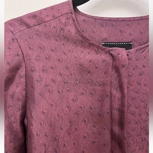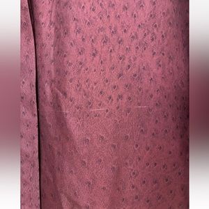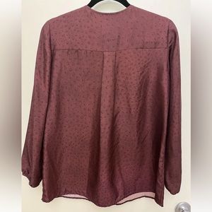 Elevate your wardrobe with this stunning Longchamp silk blouse. Featuring a beautiful burgundy maroon color with an animal print pattern, this blouse is a must-have for any fashion-forward woman. The blouse has long bell sleeves, a crew neck with a button closure, and is made from high-quality silk.