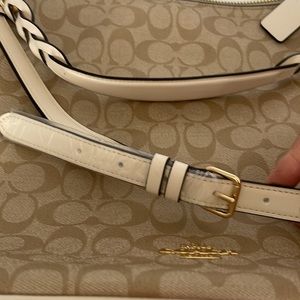 Signature coated canvas and smooth leather| Inside snap pocket| Zip-top closure, fabric lining | Detachable handle with 12 3/4" drop| Outside zip pocket| Detachable strap with 19" drop for shoulder or crossbody wear| 12 1/4" (L) x 12 1/2" (H) x 3 3/4" (W)
