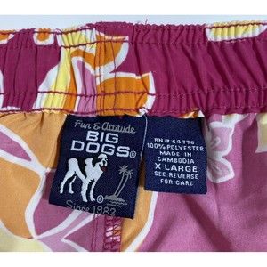 Big Dogs Shorts Men's XL X Large Pink Yellow Orange White Tropical Floral Bright Bold Loud Logo Spell Out Vintage Retro 90's Y2K 2000's Throwback Fun Funky Vivid All Over Print Spell Out Swim Trunks. New without tags! Please see all pictures and read the measurements. 100% polyester. These look and feel like swim trunks but do not have a liner inside. Stretch waist with drawstring. Hook/loop closure pocket on left side.