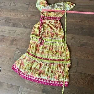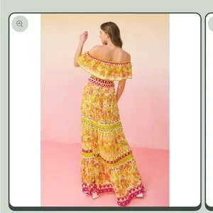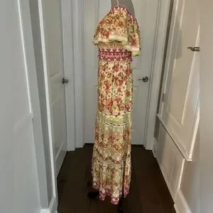 A printed woven maxi dress featuring off shoulder neckline with flounce, elasticized waist with self sash tie and tiered skirt Details Self: 100% Rayon Size & Fit - Measurements shown in photos. Excellent New With Tags Condition. Smoke free home.