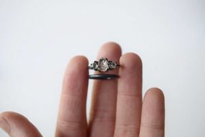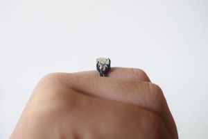 This ring features three diamonds each raw and fresh from the earth, set in a solid sterling silver band which has been oxidized.