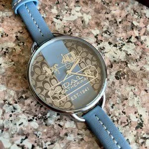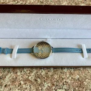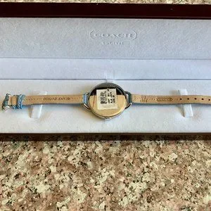 This a brand new Women's Coach watch. It features a stainless steel case, genuine leather strap, and is water resistant. The watch measures just over 8.5 inches in length and the case diameter is approximately 1.375 inches. This was purchased back in 2008 so it is not a style you will probably ever find again, especially in this condition. It retailed for $298. The watch will need a new battery. Comes from a smoke free home.