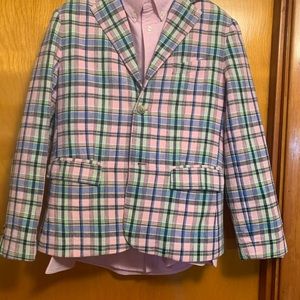 Willing to sell as a set or three separate pieces. First a nwt Janie and Jack plaid sports jacket in a size 12 NOT husky or slim but a straight 12. $50. Next is a pink long sleeve Ralph Lauren shirt also in new condition without tags $10. Then a navy blue pair of slacks from Cat &Jack also a 12 also in new condition for $15. Contact me for additional details. Smoke and pet free hair home. All In ready to wear condition