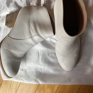 Used condition SW boots. 9.5 size, leather, white color, 3.5 inch heels. Back zippers are gold color and slightly worn. SW small letters initials on the heels. Super cute boots.