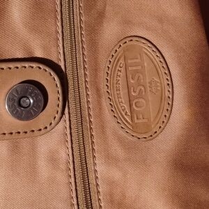 Beautiful and clean condition no threads coming undone some light signs of age but still amazing condition and sturdy. Large fossil bag leather and pressed canvas. No odors. There's a tiny two dots from a scratch on front see pic.