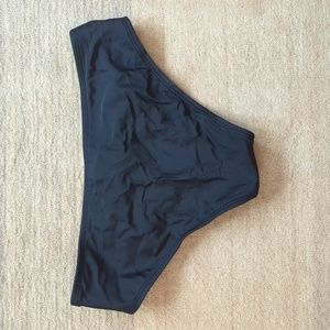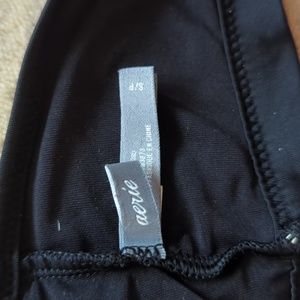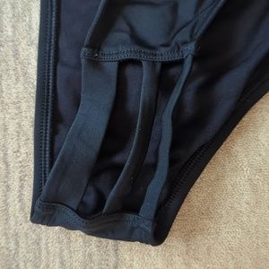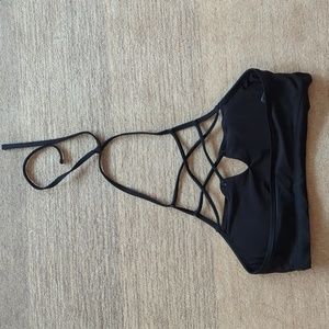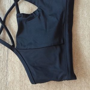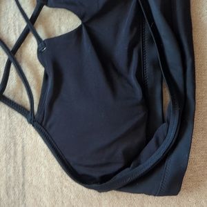 The top has a lace up detail in the front and removable cups. The bottom has cutouts with straps along the sides. Hipster fit.