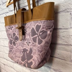 LL Bean Vintage 90s Purple Floral Hawaiian Canvas and Leather Tote Bag Y2K EUC