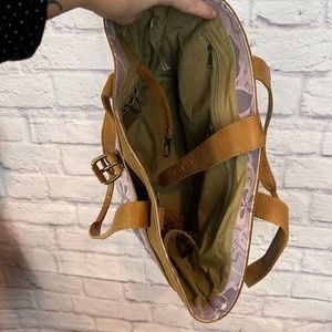 in very good pre owned condition, very clean inside and out, very minor wear. Heavy duty purple floral canvas with tan leather trim and handles, clasp and buckle detail closure. Gorgeous bag!