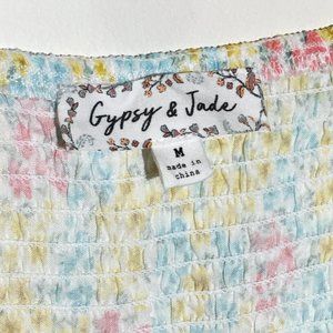 This floral Gypsy & Jade summer/sun maxi dress is NWOT and is a size Medium. It has a smocked bodice and ruffles going down the front and around the hem. It is lightweight with pastel yellows, greens, pinks, and blues on a white background. The straps are adjustable to get your desired length and fit.