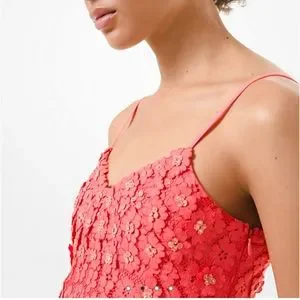 Nothing says spring like a floral lace dress in a punchy hue. Designed to contour the frame, sparkle in the sun or under the lights, and draw attention as soon as you enter the room. Features bead-and-sequin embroidery and a ruffled hem that gently sways with each step. Adjust the delicate shoulder straps and pair it with neutral-hued leather extras or pops of extra color. Wear it for date night, bridal shower, wedding, girls' night or simply wirh sandals and white sneakers. And dont forget about the Derby parties. Very versatile. Sold out!