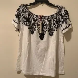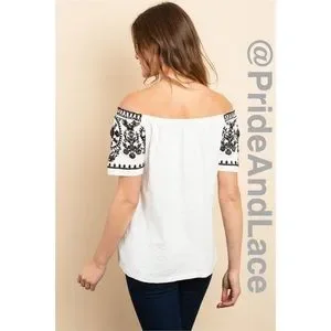 -Short sleeve off-shoulder embroidered yoke detail tunic top.