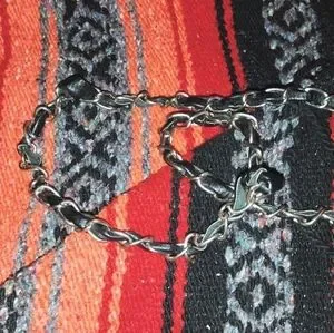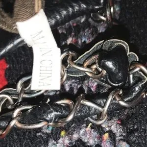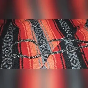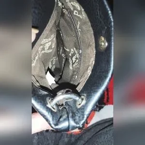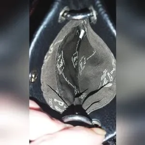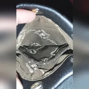 Women's cross design P&G crossbody bag leather with rear exterior slip pocket magnetic button closure and leather strap with silver metal loop link overlay. Bags interior is in great condition as well as the exterior the only flaw is the leather strap has become bunched in some spots noted in photos. Strap needs to be straightened out and the bag will be ready for lots of crossbody action.