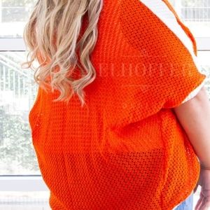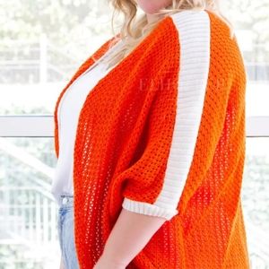 Galactic Rebel dolman shrug by Elhoffer Design. The open-front dolman style cardigan is made from acrylic/poly blended yarn, and features a vibrant orange and white colour combination, perfect for any Rebel themed outfit.