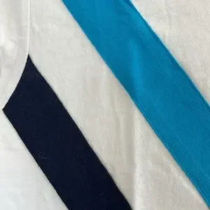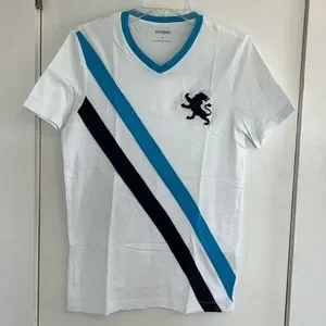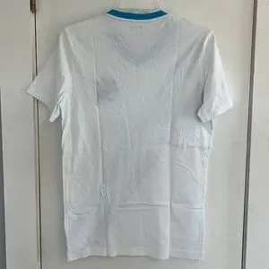 Men’s V-Neck Short Sleeve Cotton Tee. Unique and versatile! Stunning diagonal blue & navy stripes with left chest embroidered logo. Blue trim v-neckline. Worn and laundered once so like new.